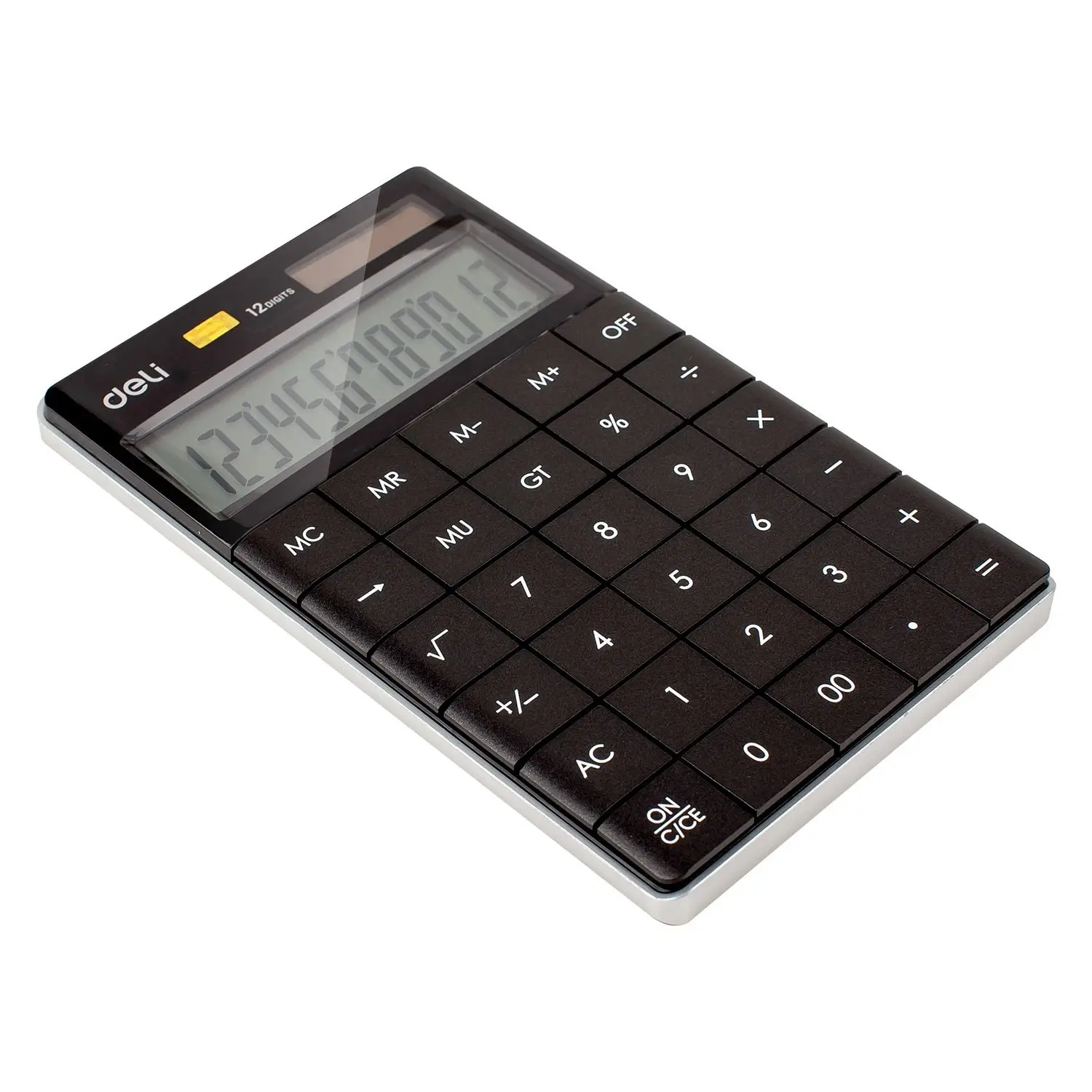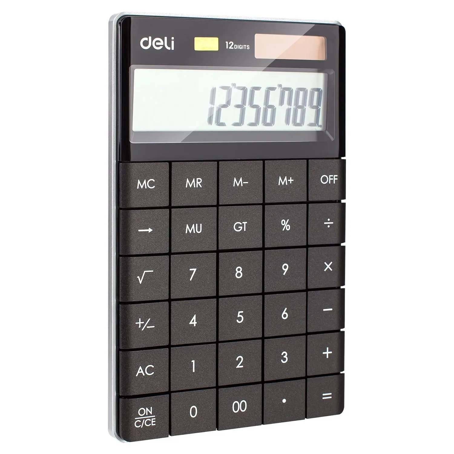 The Deli Touch Series E1589P offers a sleek black acrylic soft surface design with durable plastic keys for a premium look and feel. This 12-digit desktop calculator provides all essential functions including GT summation, percentage, square root, MU rate, and 4-key memory, making it ideal for schools, offices, and professional use.
