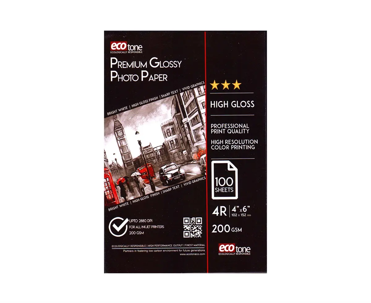 Bring your photos to life with Ecotone 4R (4×6) Single-Sided Glossy Photo Paper. Perfect for home, office, or professional printing, this high-quality glossy paper ensures sharp, vibrant colors and smooth finishes. Each sheet delivers a premium feel and professional photo-quality results, making it ideal for albums, gifts, or creative projects. Available in convenient packs of 100 sheets, this paper provides consistency and reliability for all your printing needs.
