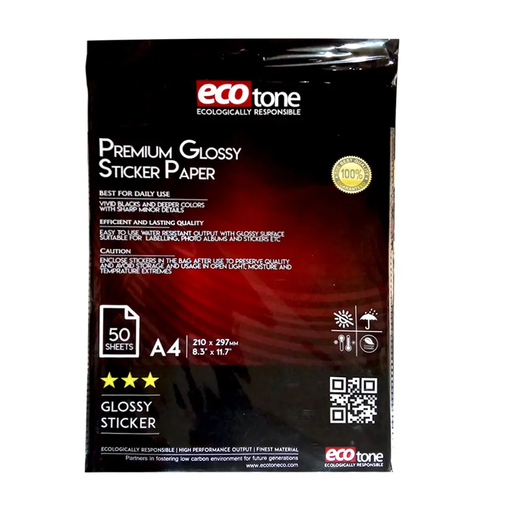 Create premium-quality labels, crafts, packaging stickers, and office tags with Ecotone Glossy Sticker Paper. Designed for crisp printing and strong adhesive performance, these sheets give your artwork, branding, and labeling projects a highly polished, professional finish. Ideal for inkjet & laser printers, this paper provides vibrant colors, fast drying, and long-lasting sticking power for both home and commercial use.