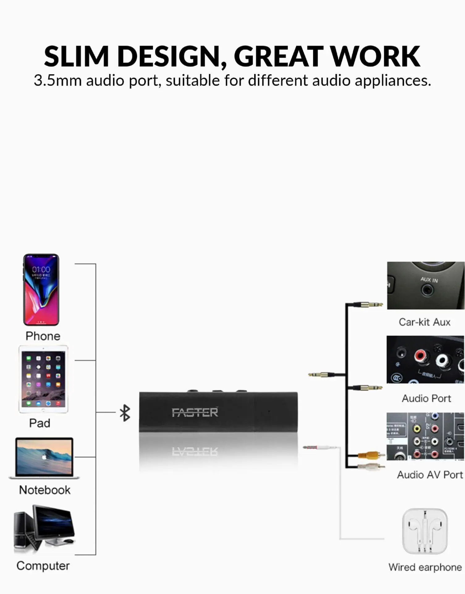 Audio Output: 3.5mm jack (compatible with headphones, speakers, car audio)