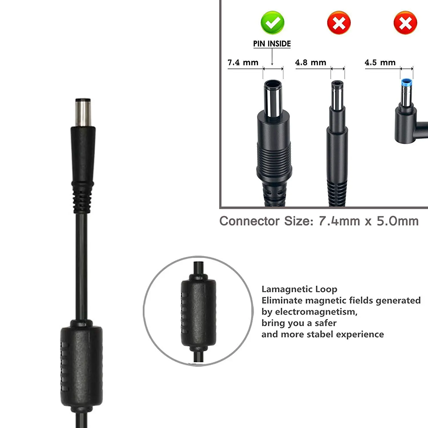• 7.4 mm × 5.0 mm round connector for secure fit