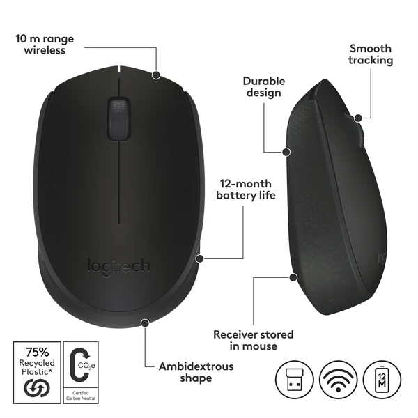The Logitech M170 Wireless Mouse is a simple, dependable wireless mouse designed for everyday computing tasks. With its reliable 2.4 GHz connection, ergonomic design, and plug‑and‑play USB receiver, it’s ideal for home, office, or travel use. The M170 delivers smooth tracking, comfortable handling, and long battery life in a compact form factor.