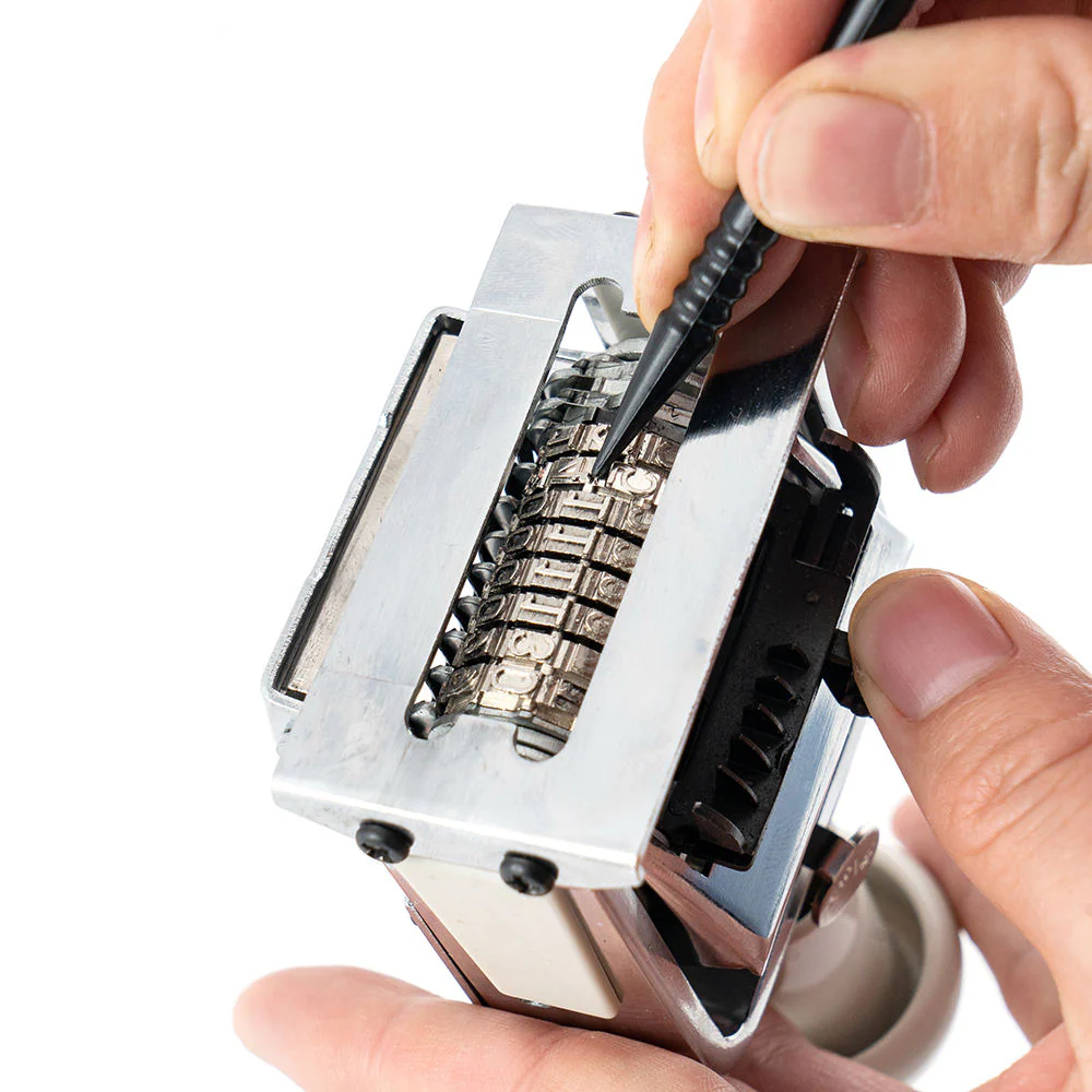Setting Desired Figures: Press the handle down and push the handle lock to the right. Adjust the digits using the attached plastic stick. If preceding zeros are not needed, set digits to zero before stamping. Press down to lock the digit in place.