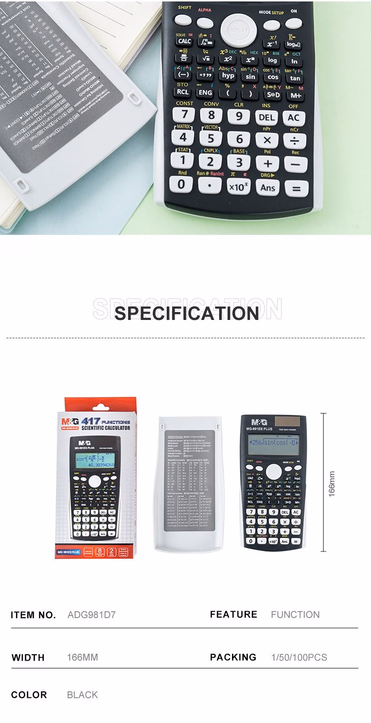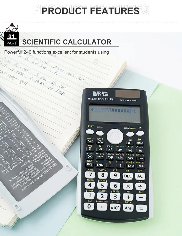 The M&G Scientific Calculator MG-991ES Plus ADG981D7 is a feature-rich scientific tool designed for students, engineers, and professionals. Equipped with 417 functions, it supports calculus, trigonometry, logarithms, matrix/vector calculations, and complex number operations.