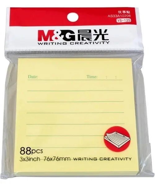 Stay organized and boost productivity with the M&G Sticky Notes YS-125, designed with 9mm ruling for neat writing and easy reminders. The compact 3×3 inch size makes it ideal for quick notes, to-do lists, office desks, planners, bullet journals, and study use. With strong adhesive backing, these sticky notes securely attach to paper, walls, monitors, and other smooth surfaces without leaving residue.