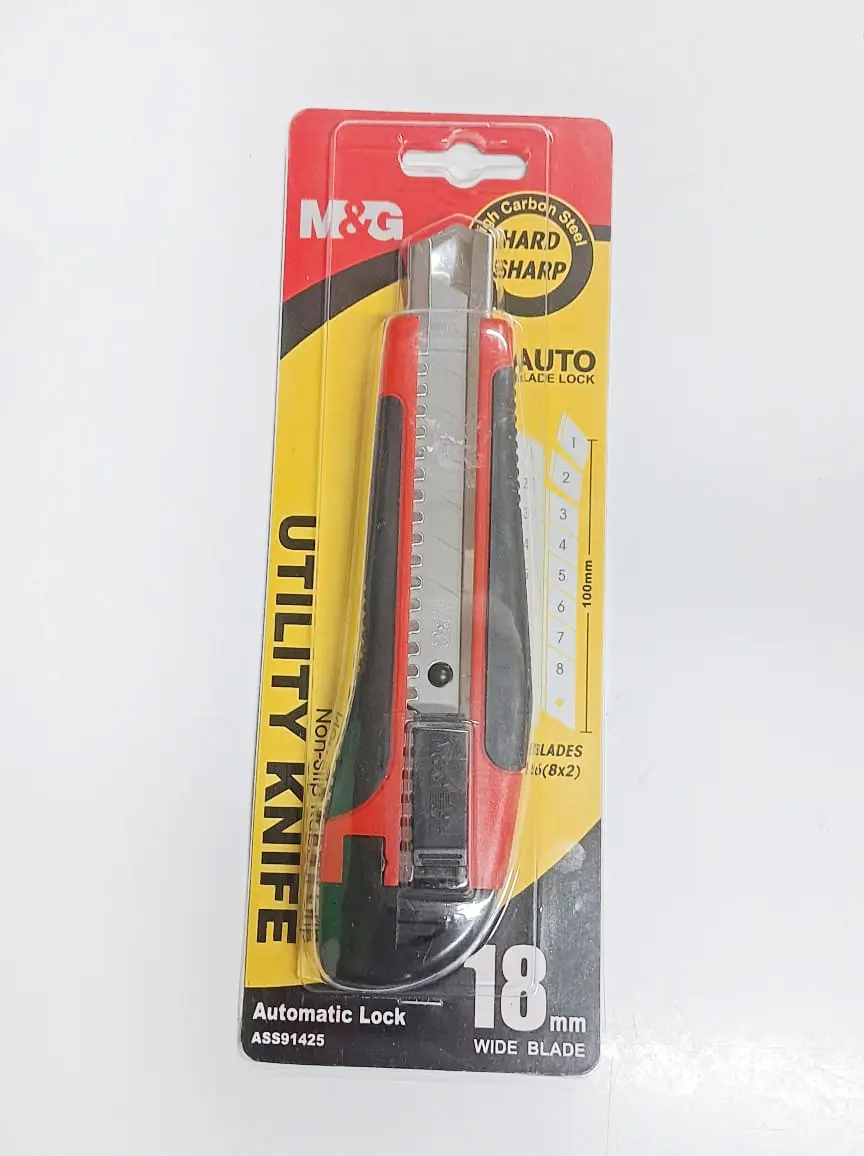 The M&G ASS91425 Utility Knife is a reliable, heavy-duty cutting tool built for precise performance in packaging, office work, crafts, and DIY tasks. Featuring a high-carbon steel blade, non-slip rubber grip, and a secure auto-lock system, it ensures smooth cutting with maximum control. With 8 snap-off segments, a removable cap that works as a snap-off device, and built-in extra blade storage, this cutter is designed for long-lasting convenience.