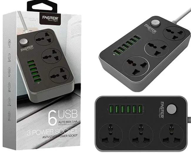 Introducing the Faster FUS-630 Extension Board, a versatile power solution featuring 3 power sockets and 6 USB ports. With a 200cm power cord, this extension board provides flexibility in placement. The 6 USB ports, equipped with Auto Max technology, deliver a combined output of DC 5V==3.4A (17W), ensuring efficient and adaptive charging for your devices. The Faster FUS-630 is designed to meet your power needs with reliability and convenience. Backed by a 1-year warranty, it’s a trusted choice for efficient charging.
