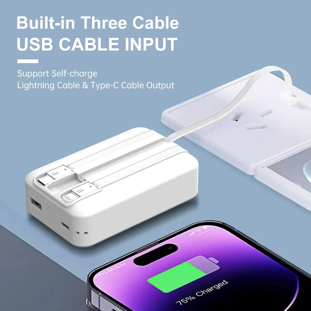 • Built-in Three Cables: USB input, Lightning, and Type-C outputs — no need to carry extra cables.