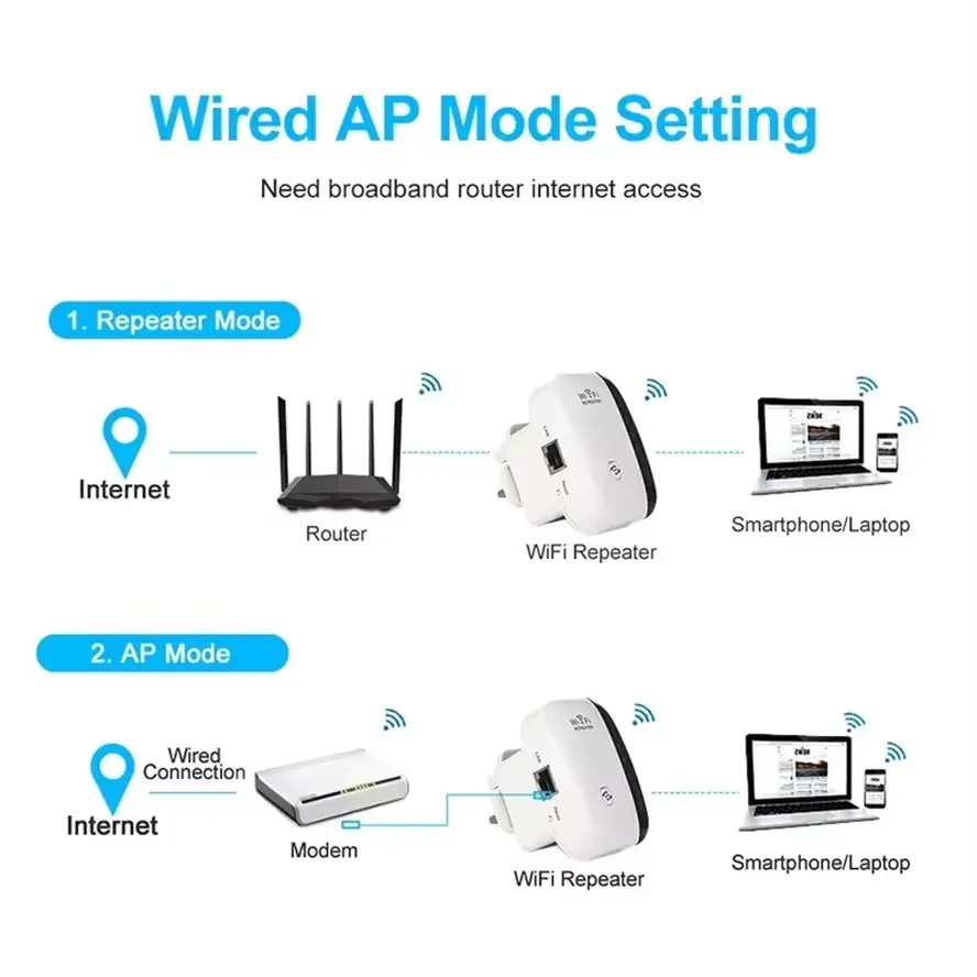 The WiFi Range Extender is designed to amplify your home or office wireless network, eliminating dead zones and delivering stable, high-speed connections to every corner. With multiple working modes, universal compatibility, and simple setup, this device ensures smooth internet access for all your devices without complicated installation. Ideal for TVs, smartphones, computers, smart plugs, cameras, and other smart home equipment, it brings seamless connectivity wherever you need it.