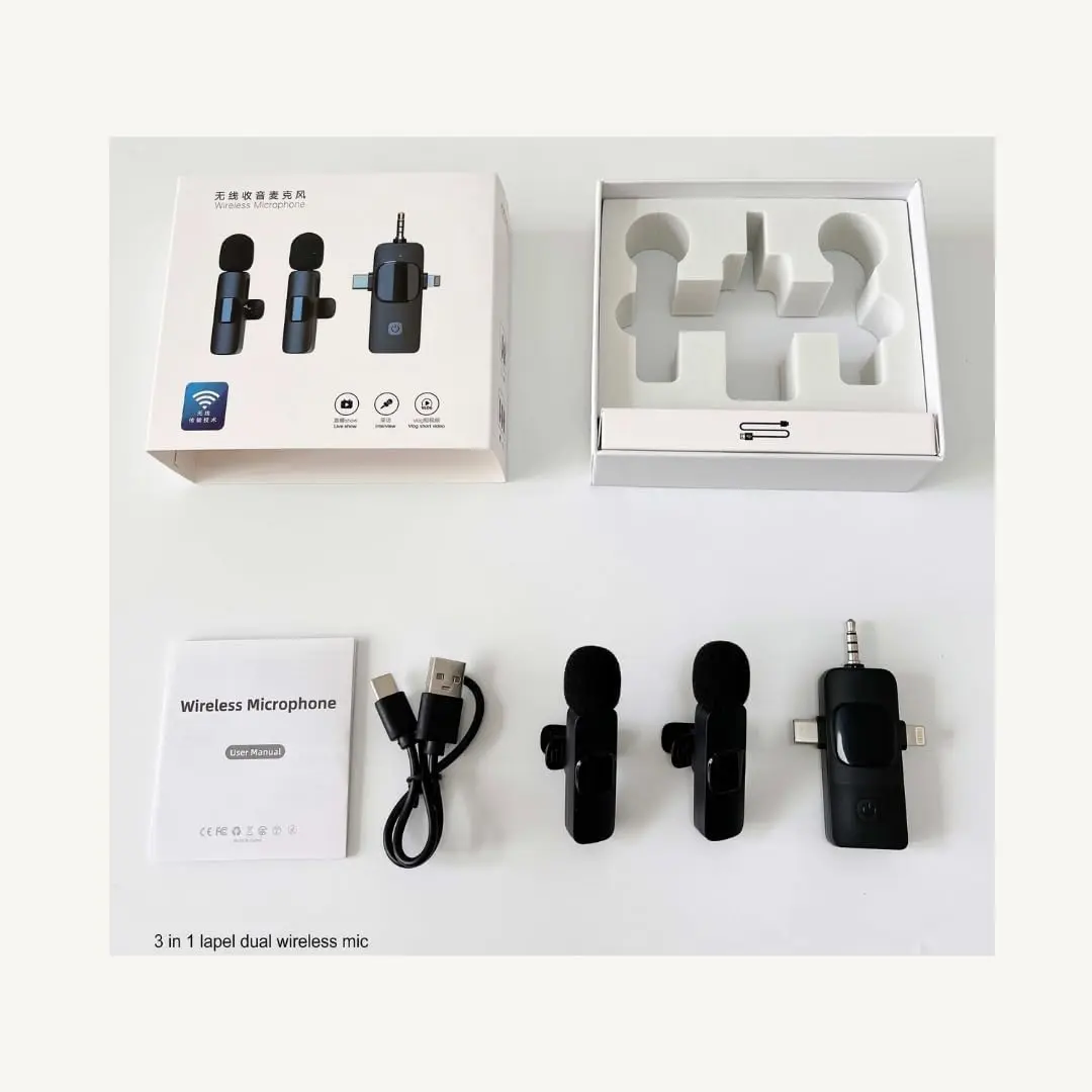 Capture crystal-clear audio with the K15 2-in-1 Wireless Lavalier Microphone — a versatile, plug-and-play mic set ideal for vlogging, interviews, live streaming, or mobile recordings. The 2-in-1 system includes a clip-on lav mic transmitter and a receiver that connects directly to your device.